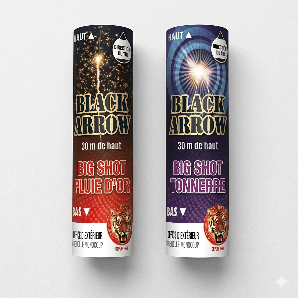 Doublez l’impact de votre spectacle avec le duo Black Arrow ! Ce pack contient deux chandelles monocoups de gros calibre, conçues pour offrir deux expériences sensorielles radicalement différentes et complémentaires.