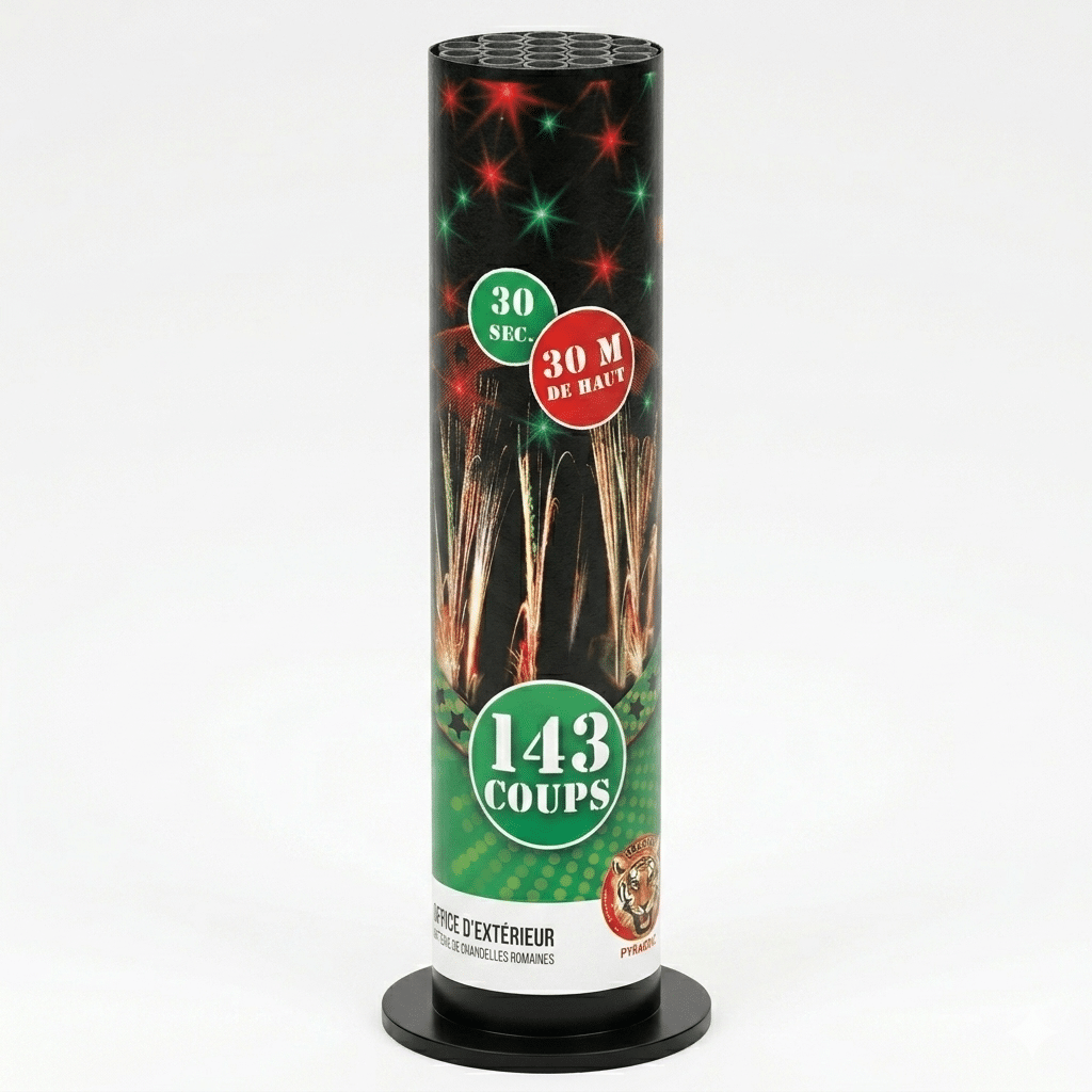 Une véritable roue de paon lumineuse dans votre jardin ! La chandelle Œil de Paon 143 coups est un artifice ultra-dynamique qui s’apprécie pour sa cadence effrénée et la variété de ses effets.