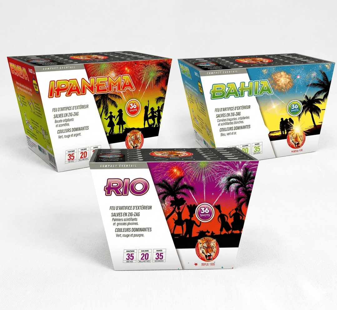 Pack feu d'artifice 36 tirs : Le Trio Carnaval (Ipanema, Rio, Bahia)
